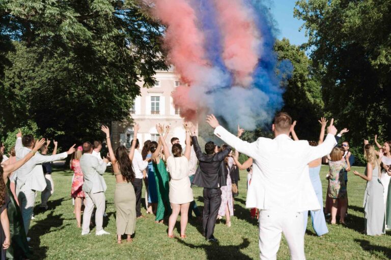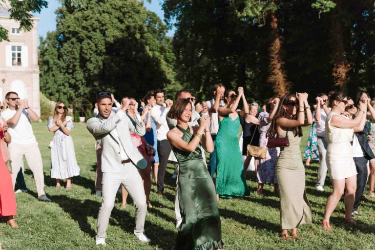 Vers 17h, retour au Château de Trouhans pour le début du vin d’honneur en extérieur. Le soleil était au rendez-vous, et les invités ont pu profiter du parc pour échanger, rire et se retrouver autour de plusieurs animations bien pensées. L’un des temps forts de cette fin d’après-midi fut sans conteste la flashmob surprise organisée par les mariés. Et pour clôturer la danse, un feu d’artifice a été lancé, grandiose !
